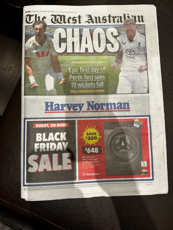Well that was interesting. To win a Test match you've got to take 20 wickets. Taking 10 cheaply to secure a first innings lead isn't enough. Attendance over the two days was close to 100,000 (51,000 yesterday and 49,000 today), by far the biggest crowd Ive ever been to for a Test match. When you think that the capacity at Lord's is 26,000 and that is our biggest ground, you get the idea. I had an elevated view today which enabled me to look at the whole field of play at once see the pic below We lost this game because key wickets were thrown away with daft shots ( "How to snatch defeat out of the jaws of victory" by B McCullum is a good reference) and our bowlers just didn't perform today they all looked knackered with no stamina. Okay there were a couple of controversial umpiring decisions. Was Mitchell Starc's catch off his own bowling to dismiss Zak Crawley for his second first over duck of the match clean?. The law regarding a clean catch is not a...